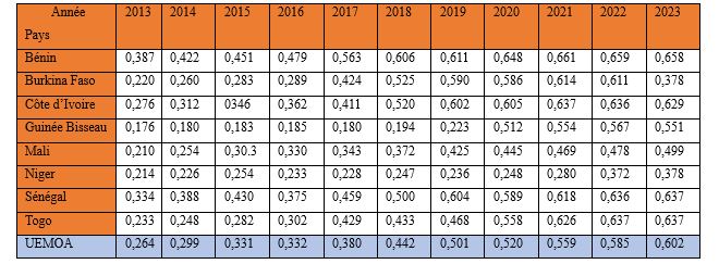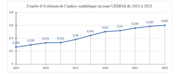 Dans l’espace sous-régional ouest africain le niveau global de l’inclusion financière dans toutes ses dimensions (taux de bancarisation strict et élargi, taux d’utilisation des services financiers, taux global de pénétration géographique des services financiers…,) peut être appréhendé à partir d’un indice synthétique. Ce taux est passé de 0, 264 en 2013 à 0,602 dans l’espace UEMOA en 2023.