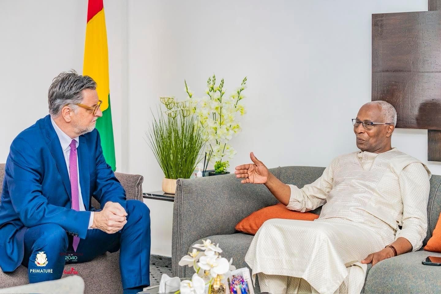Le Premier ministre guinéen, Amadou Oury Bah, a reçu en audience, ce vendredi, Marcus Miller, Président-Directeur général de la société allemande Clean Power, spécialisée dans les énergies renouvelables. Cette rencontre de haut niveau s’inscrit dans le cadre du suivi du projet de construction de deux centrales solaires photovoltaïques dans les régions de Kankan et de Siguiri, pour une capacité totale installée de 84 mégawatts (MW).