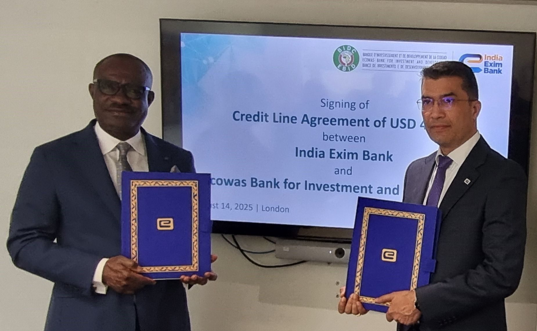 Londres, Royaume-Uni, 14 août 2025 – Dr George Agyekum Donkor, Président de la Banque d’Investissement et de Développement de la CEDEAO (BIDC) et de son Conseil d’Administration, et M. Ashok Kumar Vartia, Directeur Général de la succursale londonienne de India Exim Bank, ont signé aujourd’hui à Londres un accord de ligne de crédit commercial d’un montant de 40 millions de dollars américains. La succursale londonienne de India Exim Bank a accueilli Son Excellence le Président de la BIDC, Dr George Agyekum Donkor, et son équipe pour la cérémonie de signature.